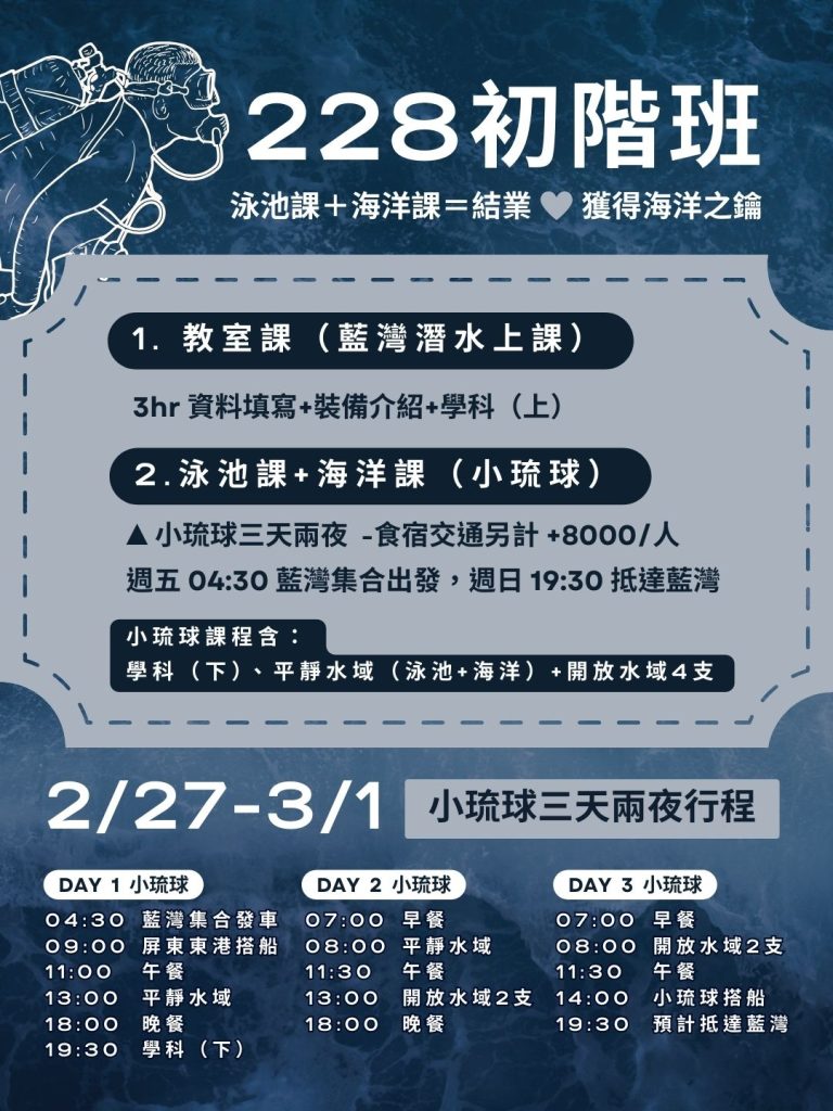 在潛季開始前趁著人潮還沒湧現、海況剛剛好的春天把那張通往海底世界的門票拿到手吧!三天兩夜的小琉球課程不趕進度、專心學好讓第一次下海,成為一段難忘的開始📩 詳情請洽官方LINE:@bluebaydiving一起在春天,開啟你的海洋人生
